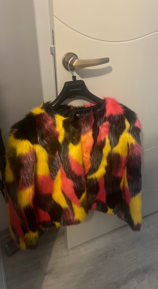 Bu sentetik kumaştan yapılmış sahte kürk ceket, koyu renkli çok renkli tie-dye desene sahiptir. Uzun kollu, yuvarlak yakalı ve bol kesimdir, partiler için idealdir.