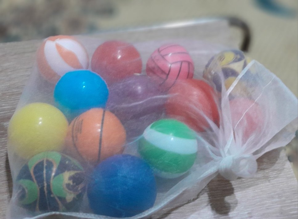 Basketbol, voleybol ve futbol desenli çok renkli mini spor toplarından oluşan set, şeffaf torbada. ⚽13 tane var