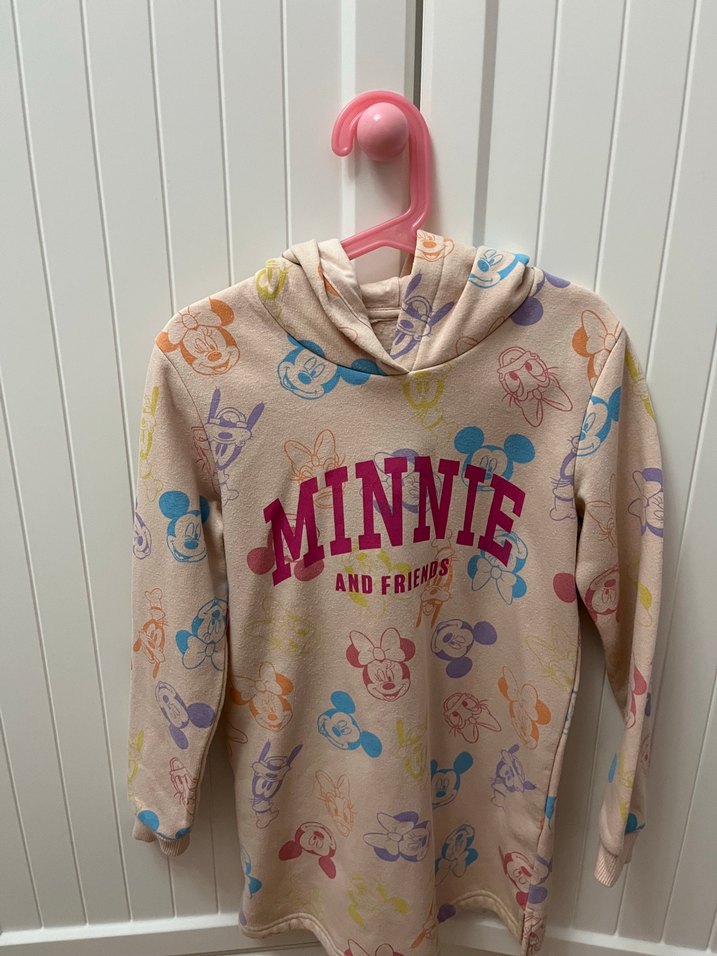 Rahat kesim, uzun kollu, yuvarlak yaka kız sweatshirtlü elbise Yumuşak örgü kumaş üzerine çok renkli Minnie ve arkadaşları baskıları bulunur.
