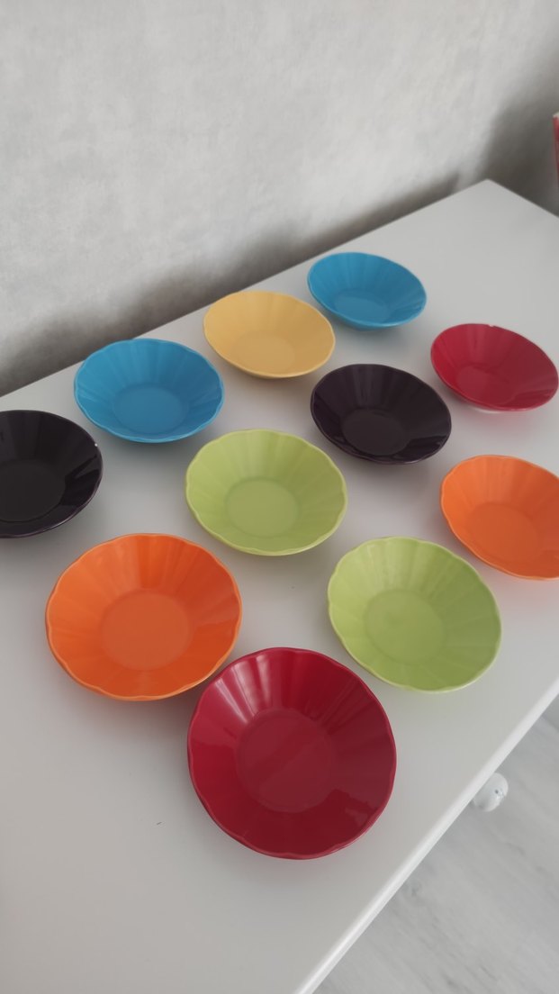 Canlı renklerde, modern tarzda çeşitli renklerde çok renkli tabak seti. ️2 tanesinde küçük defo var resimlerde mevcut