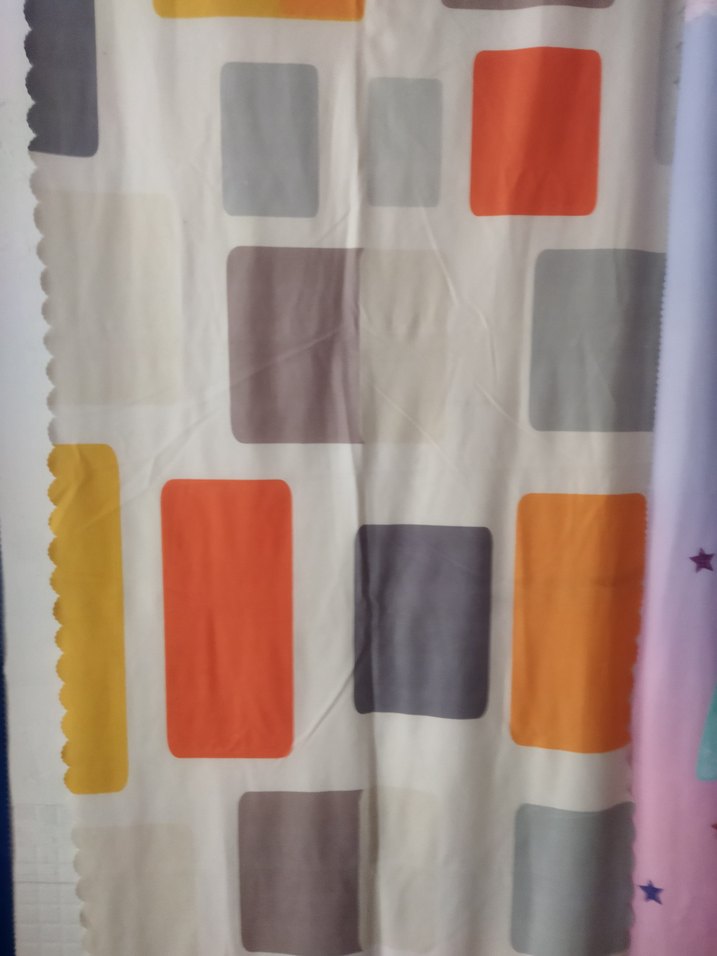 Bu perde, gri, turuncu ve sarı tonlarında çok renkli kare desenlere sahip modern bir tasarıma sahiptir.