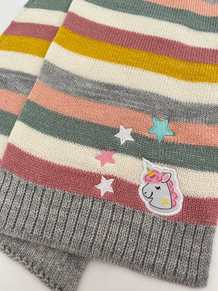 Çok renkli çizgiler ve nakışlı yıldızlar ile süslenmiş, yumuşak örgü kumaştan yapılmış çocuk atkısı.