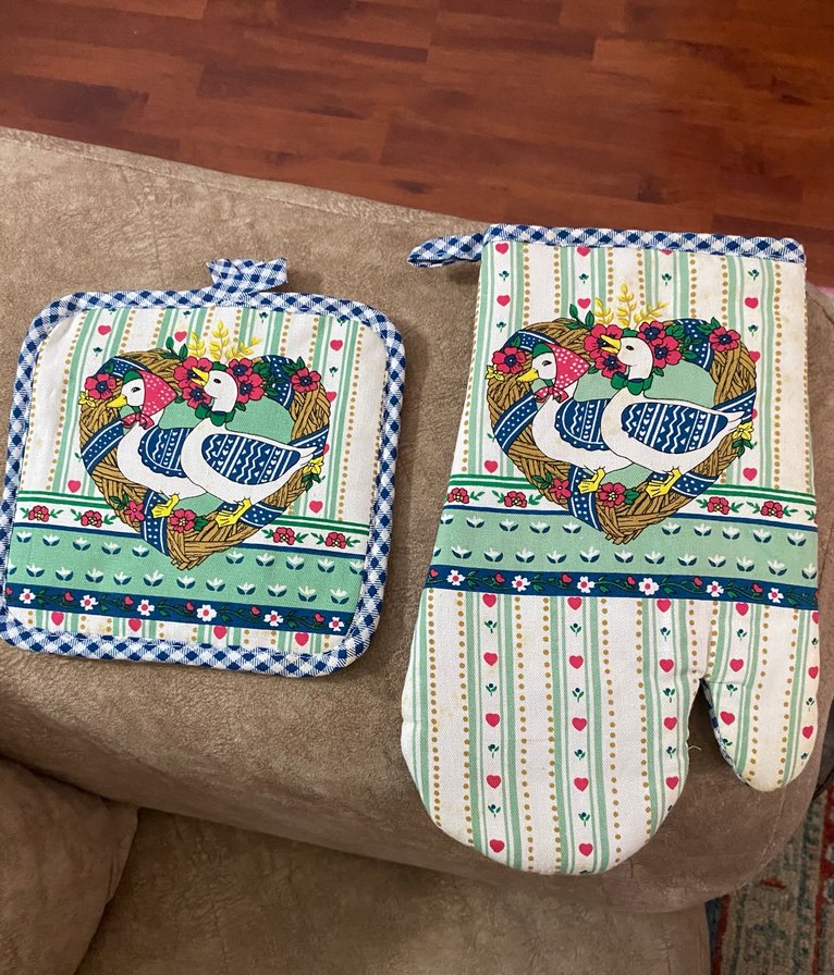 Nakışlı ördek desenli, çok renkli fırın eldiveni ve tutacak seti. Yumuşak kumaştan yapılmıştır. Hiç kullanılmamıştır