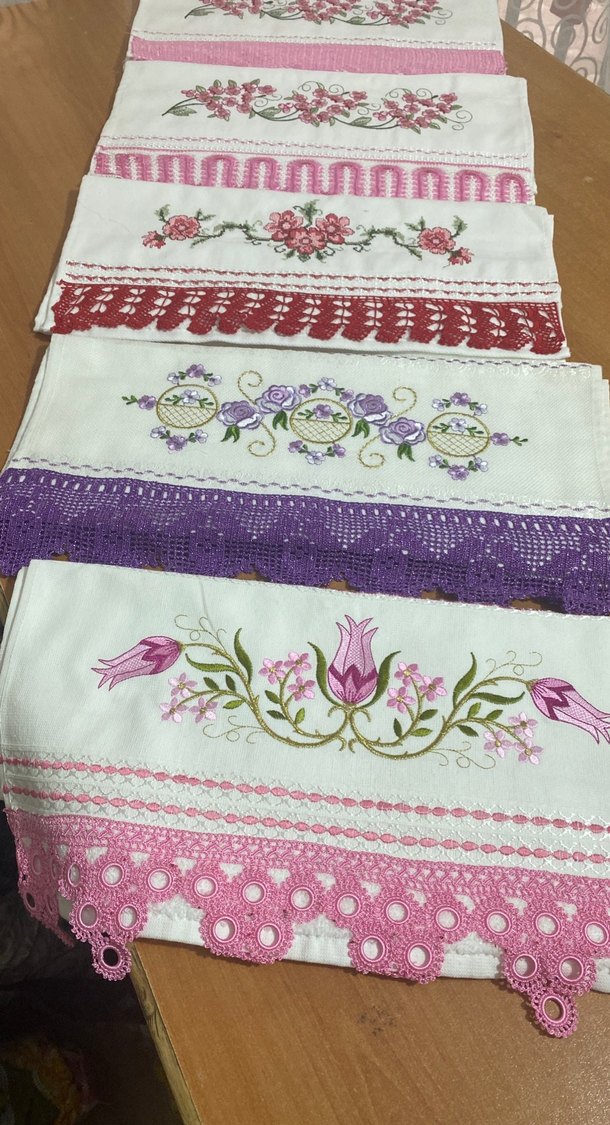 Farklı renklerde dantel uçlu, çok renkli çiçek nakışlı geleneksel havlu seti.