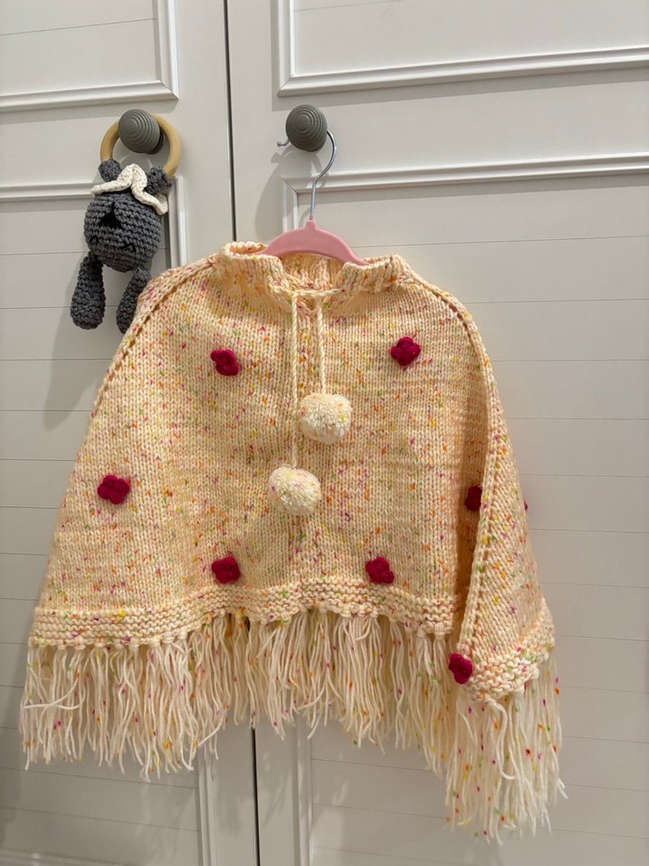 Nakışlı detaylara, yuvarlak yakaya, uzun kollara ve bol kesime sahip çok renkli örme ponço. Uçlarında püsküller ve ponpon süslemeleri bulunur.