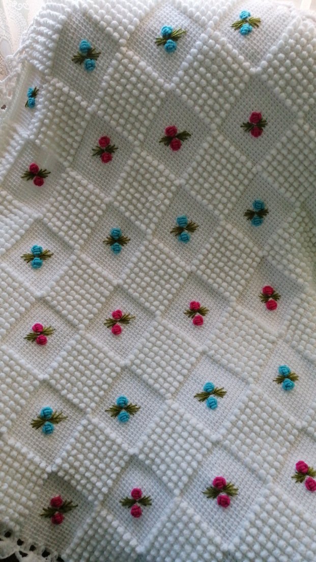 Çok renkli, örgü dokulu çocuk battaniyesi, pembe ve mavi nakışlı çiçek desenleriyle yumuşak ve rahat bir kullanım sunar.