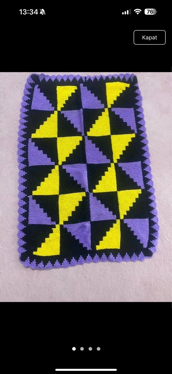 Mor, sarı ve siyah geometrik desenlere sahip çok renkli nakışlı örgü çocuk battaniyesi, yumuşak örgü kumaştan üretilmiştir.
