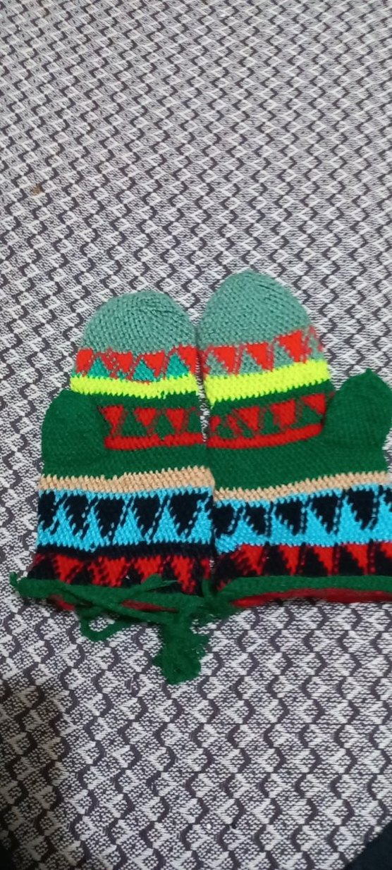 Yumuşak örgüden yapılmış, nakışlı desenlere sahip çok renkli bohem tarzda eldiveni 7 yas ile 13 yasa kadar rahat olur 5 sis ile el orgusudur
