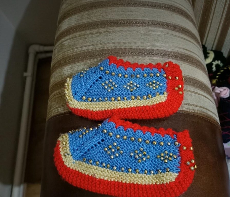 Çok renkli nakışlı örgü erkek bebek patik, boncuk detayları ve yumuşak dokusuyla bohem tarzı sunar. Rahat ve şık bir seçimdir.