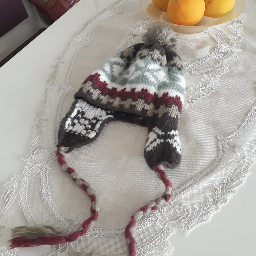 Bohem tarzı, çok renkli nakışlı ve örgü kadin bere. Kulaklıklı ve örgülü bağcıklı, sıcak tutar.