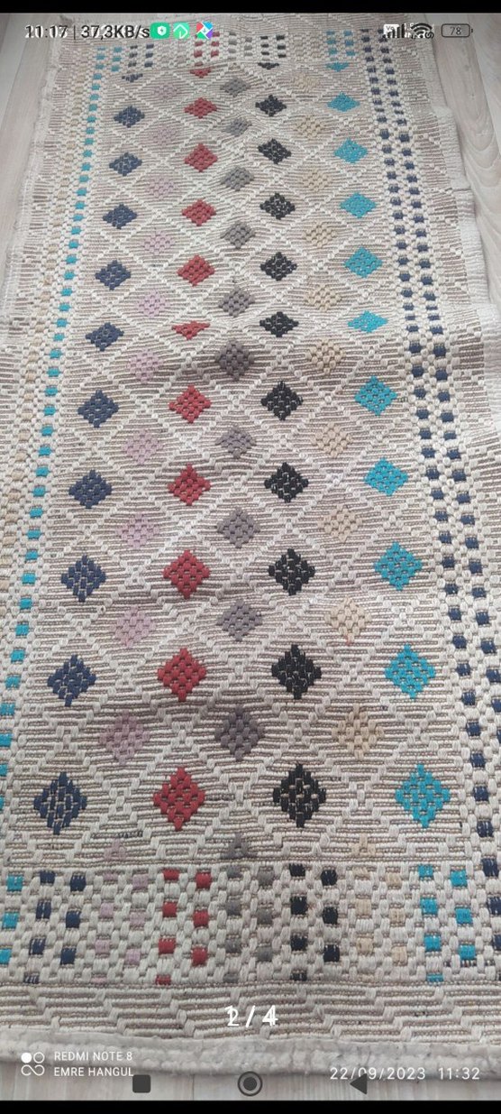 Gri zemin üzerinde çok renkli geometrik nakış desenlerine sahip Yolluk halı. Her odaya canlı ve sanatsal bir dokunuş katar. az kullanılmış elimde 2 adet var adet fiyatıdır