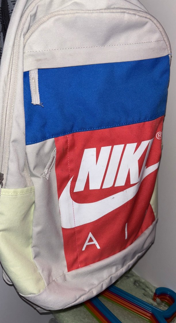 Çok renkli, önünde büyük Nike logosu bulunan, dayanıklı kumaştan yapılmış çocuk okul çantası. Açık tonlarda tasarlanmıştır.