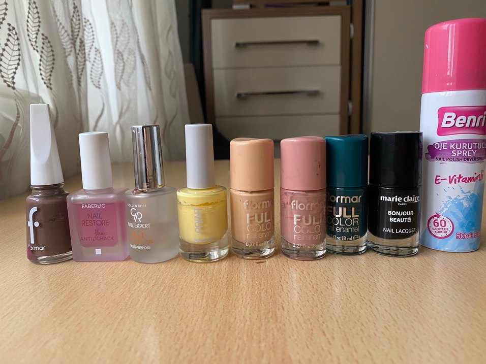 Sarı, şeftali, pembe ve yeşil tonlarında pastel renkli ojelerden oluşan set. Flormar ve BLEXPERT markaları içerir.