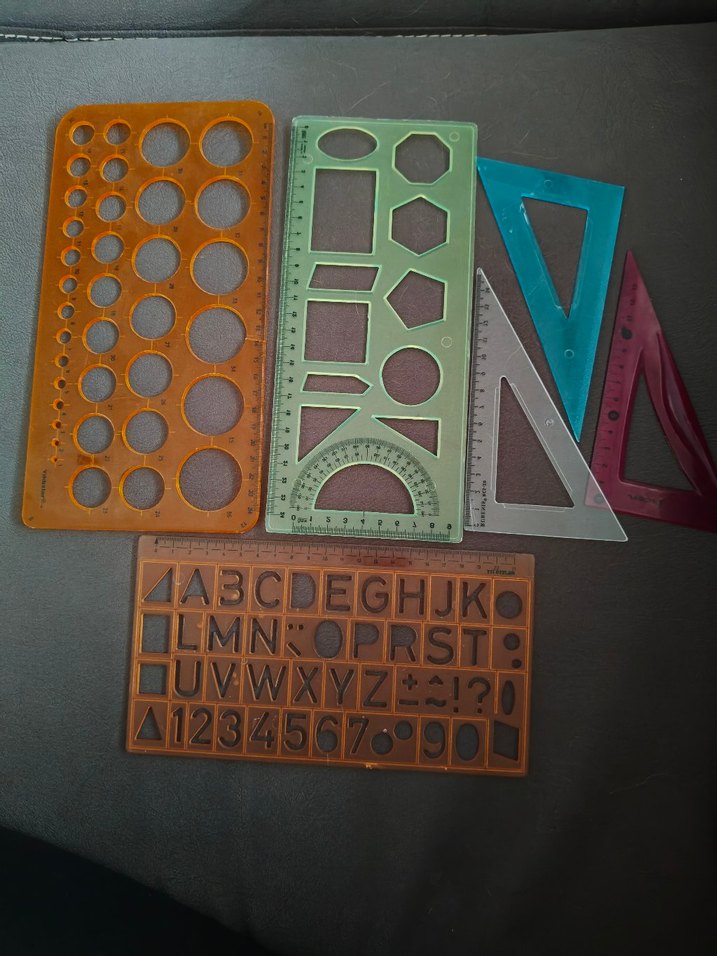 Bu set, okul etkinlikleri için çeşitli açık renkli geometrik ve alfabe şablonları ile üçgen cetveller içerir. ✏️