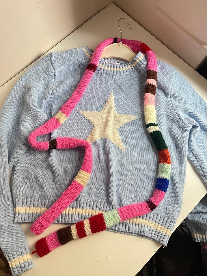 Kadın atkısı, örgü yapıda pastel çok renkli çizgilerle bohem ve rahat bir tarz sunar.