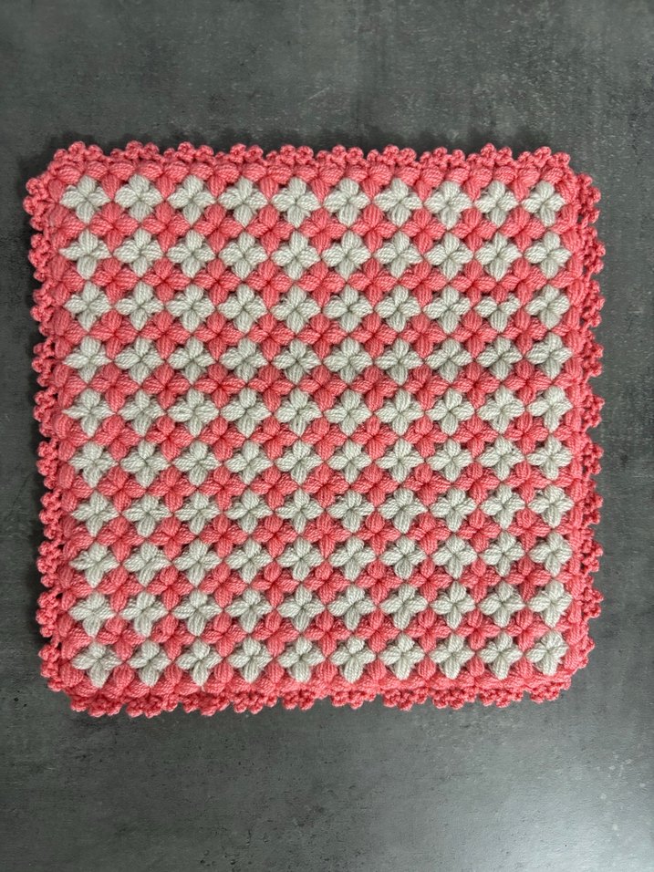 Gri ve pembe renklerin dokulu örgü desenine sahip çok renkli banyo süngeri, nazik temizlik için uygundur.
