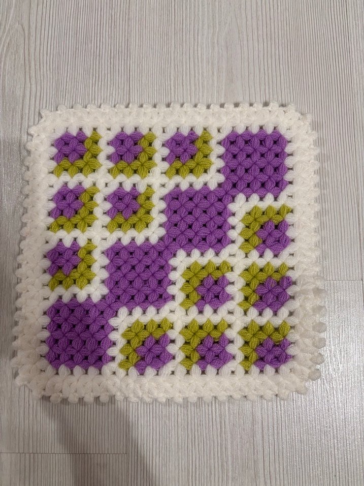 Mor, yeşil ve beyaz renklerin el işi örgüyle birleştiği banyo süngeri, nazik peeling için dokulu yüzeye sahiptir.