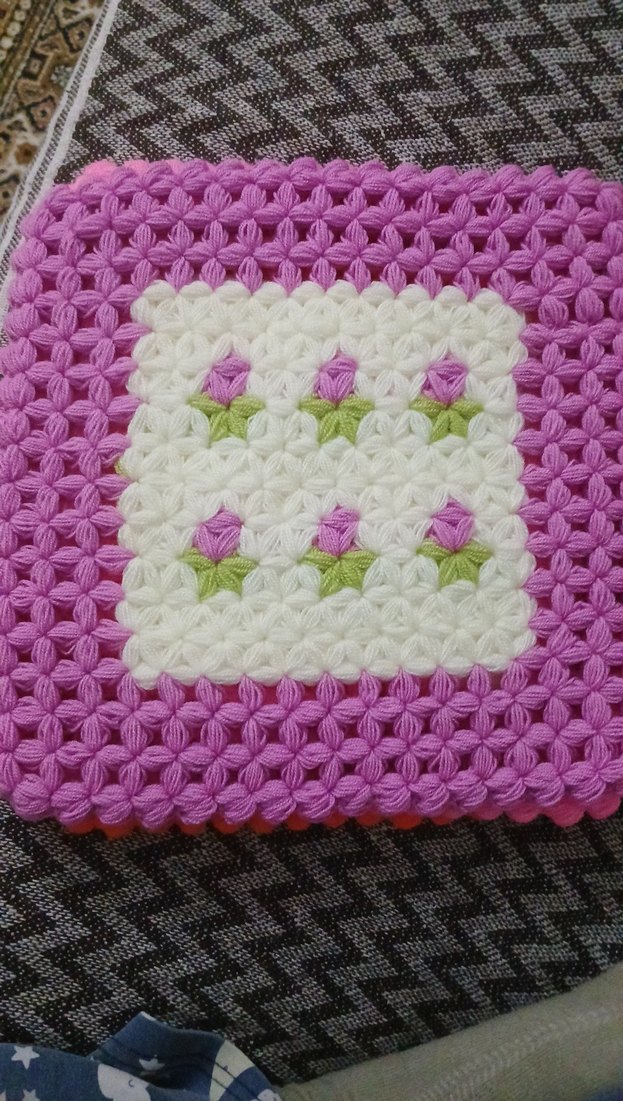 Mor ve beyaz ipten örülmüş, küçük yeşil ve mor çiçek desenleriyle süslenmiş çok renkli örgü banyo süngeri.