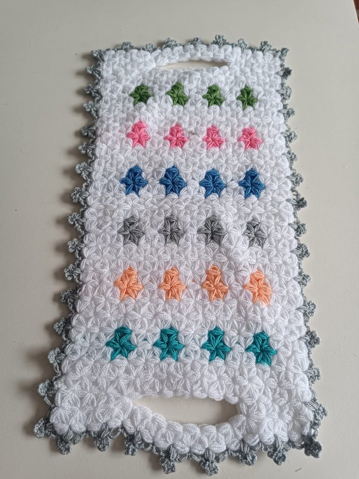 Çok renkli örgü desenli, tutma saplı yumuşak dokulu banyo süngeri.