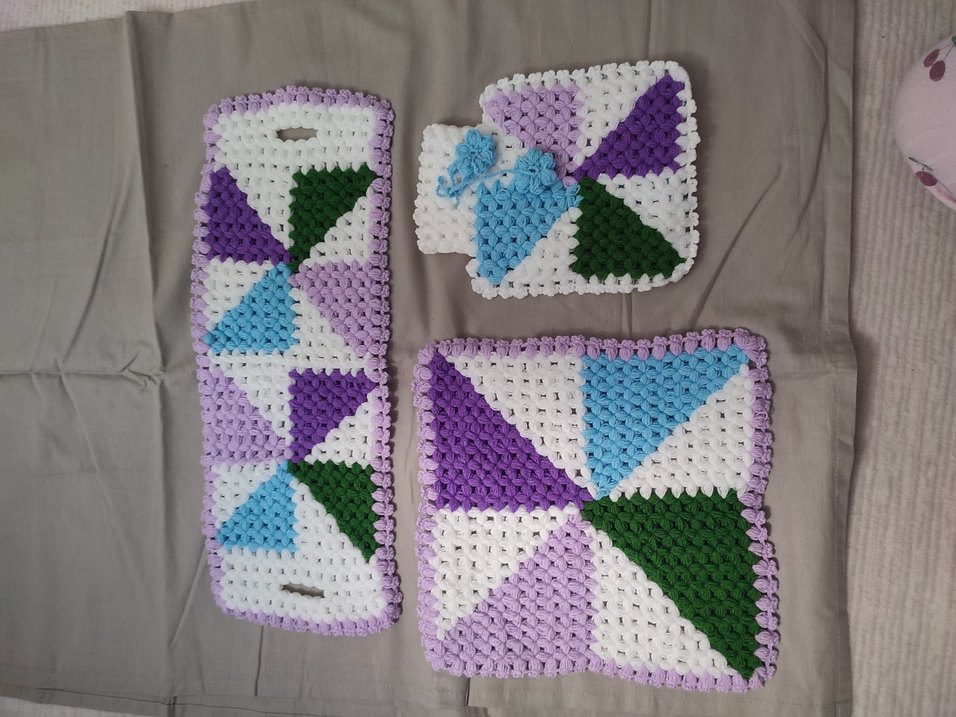 Mor, yeşil, mavi ve beyaz tonlarında çok renkli, el örgüsü banyo süngerleri seti. Dokulu tasarımıyla dekoratif bir görünüm sunar. Sıfır ürün, set fiyatıdır. Marka temsili