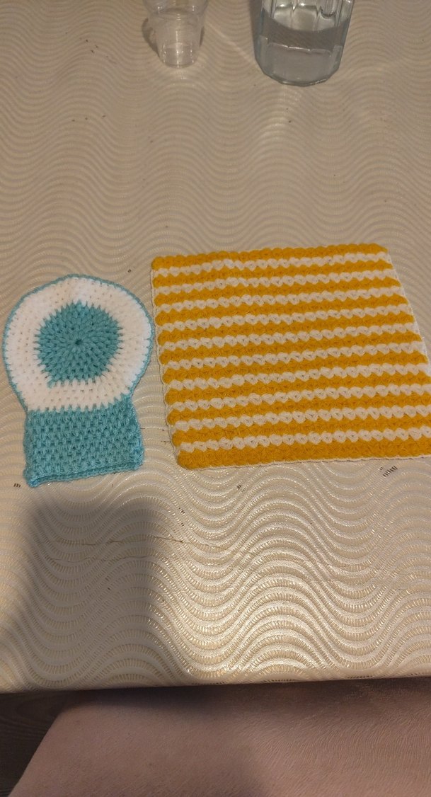 Çok renkli, örgü banyo süngeri ve uyumlu yumuşak dokulu bez seti.