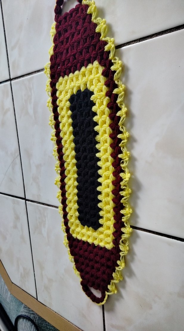El yapımı örgü tasarıma sahip, siyah, sarı ve bordo renklerinde çok renkli banyo süngeri.