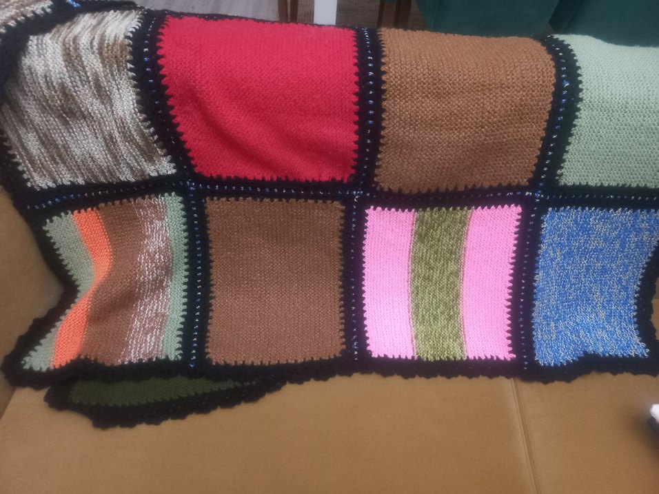 Farklı koyu tonlarda örgü karelerden oluşan çok renkli battaniye, siyah kenarlıkla birleştirilmiştir. Sıcak ve yumuşak dokuludur. ️tek kişiliktir