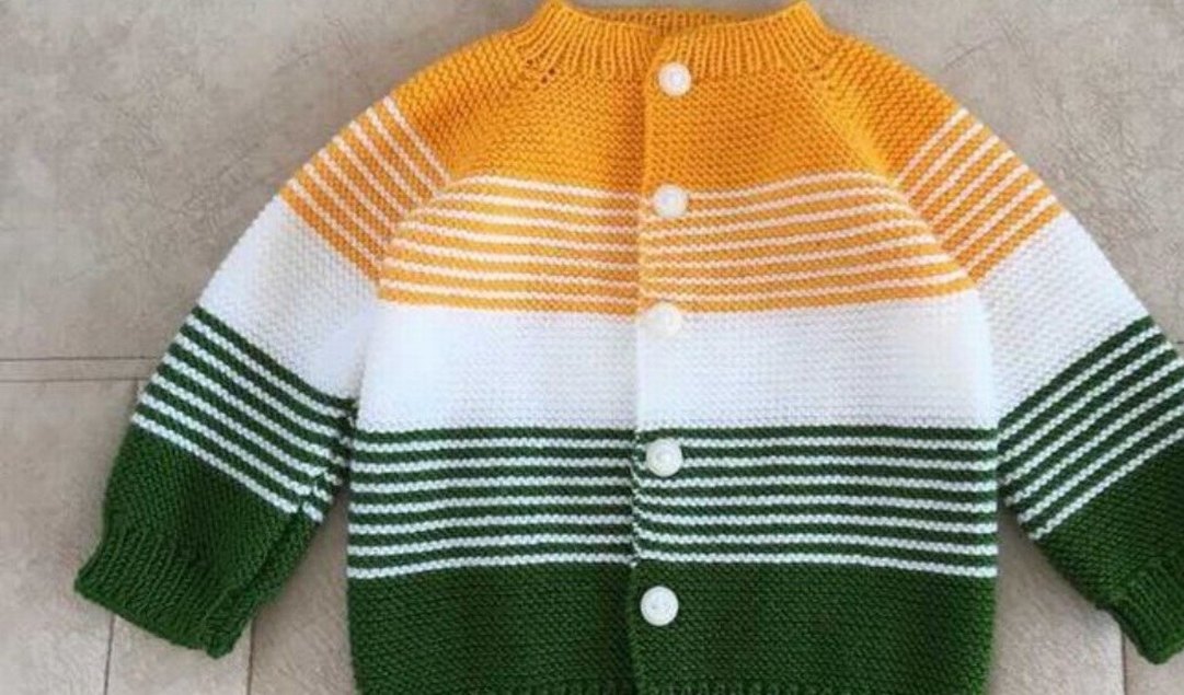 Düğmeli, uzun kollu ve rahat kesimli örgü bebek hırka, çok renkli çizgili desene sahip. Sokak modasına uygun rahat bir tasarım. istenilen renk ve modelde yapılabilir