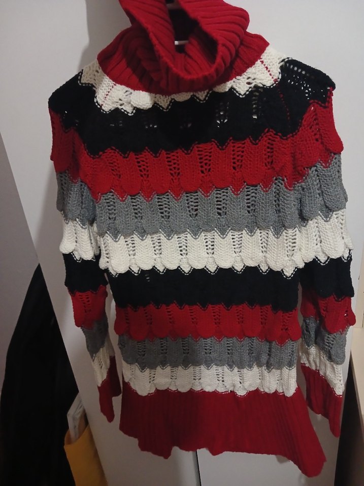 Bu kadın kazak, uzun kollu ve boğazlı, örgü desenli ve çok renkli şeritlere sahip. Rahat ve karşı kültür tarzında, günlük kullanım için uygun.