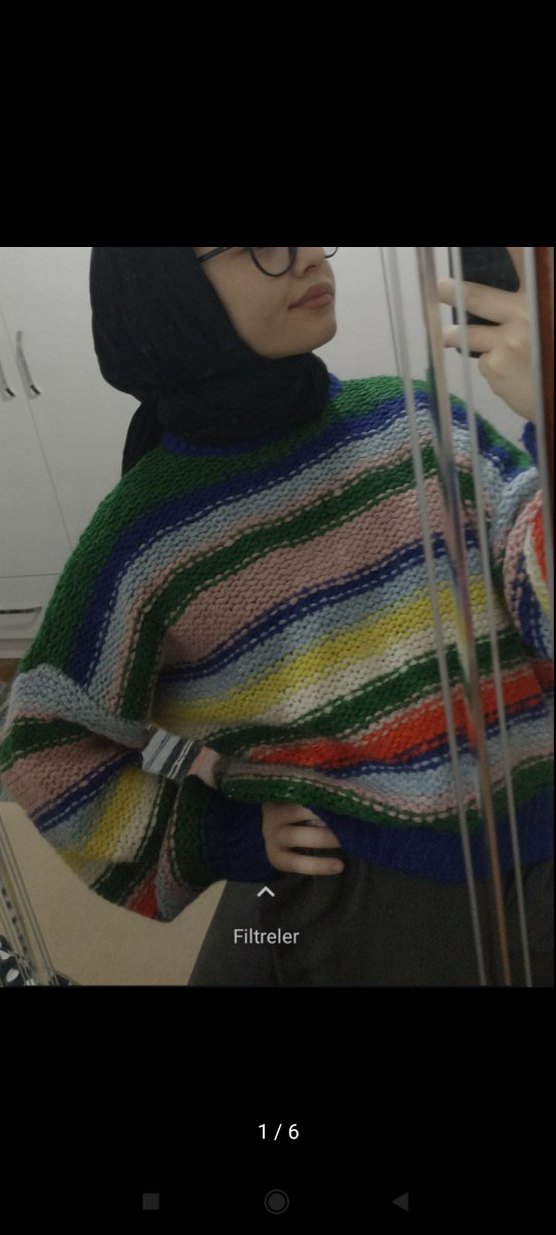 Bol kesim bohem tarzda, boğazlı ve uzun kollu çok renkli çizgili örgü kazak. Günlük kullanıma uygundur.