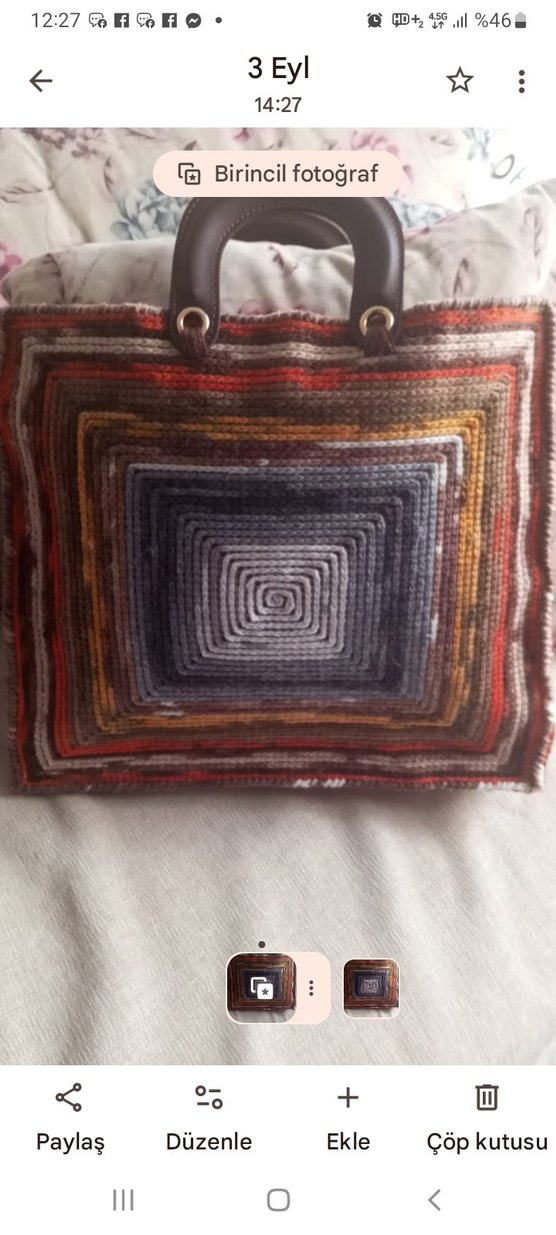 Kadınlar için çok renkli, örgü tekstil malzemeden yapılmış, bağlama desenli, bohem tarzda rahat bir çanta. Koyu renk sapları ve ortasında kare desen bulunur.