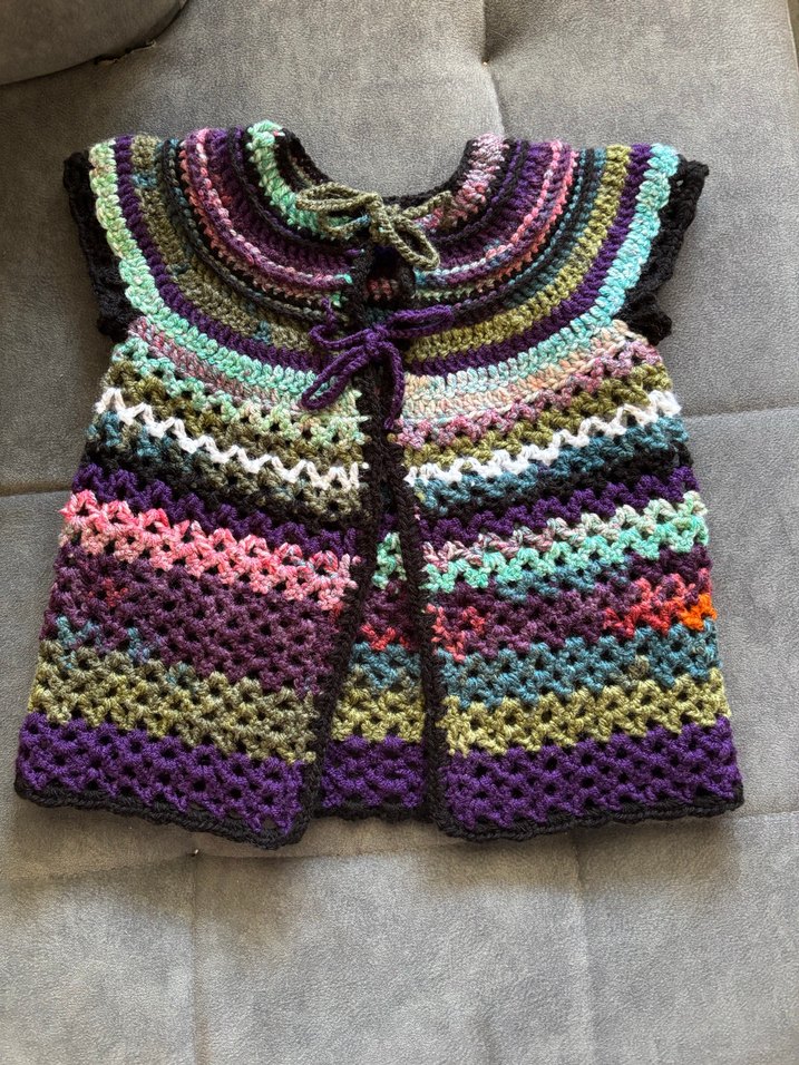 Kızlar için kolsuz, bol kesim, çok renkli ve örgü bohem tarzda yelek.