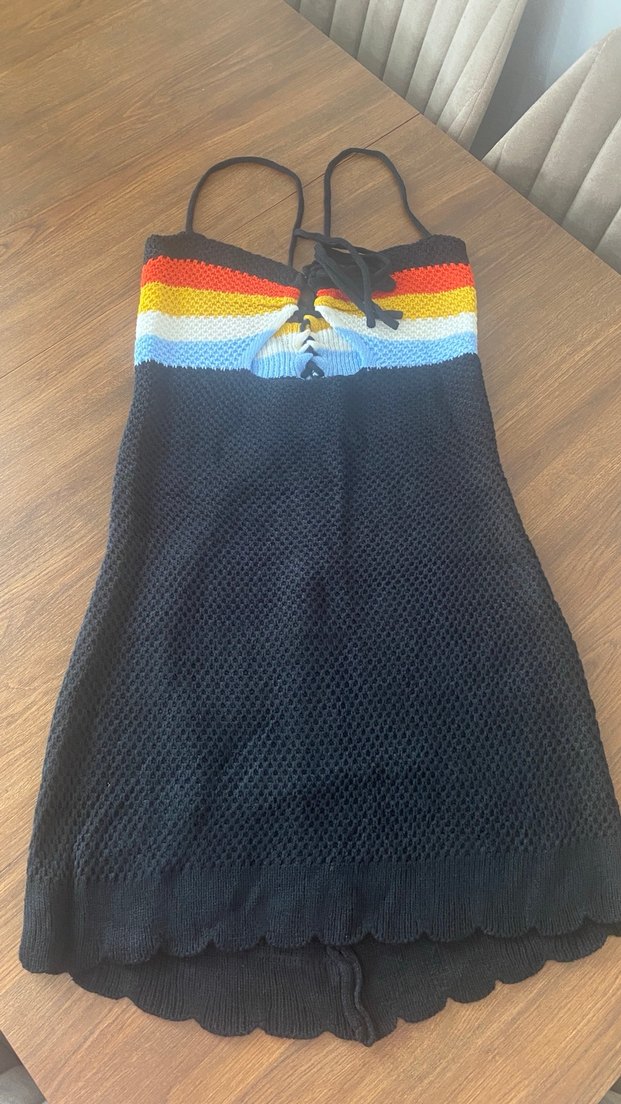 Vücudu saran örgü elbise, halter yaka ve ince askılıdır. Üst kısmında çok renkli tie-dye deseni bulunur. Midi boy ve nefes alan kumaş outdoor kullanıma uygundur.