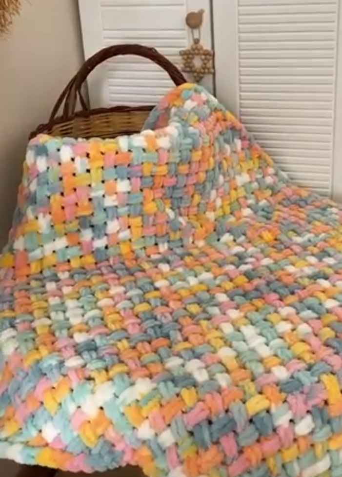 Pastel çok renkli örgü çocuk battaniyesi, yumuşak tie-dye desenli, rahatlık sağlar.