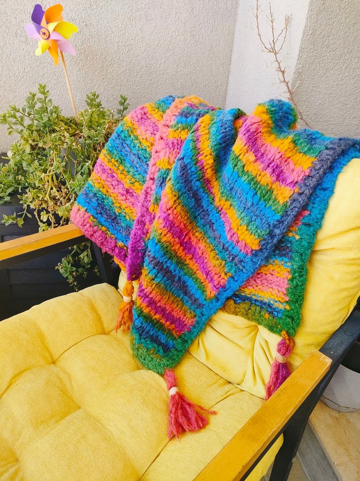Renkli örgü çocuk battaniyesi, canlı batik desenli ve püsküllü, sıcaklık ve neşeli bir görünüm sunar. 90*120 cm.