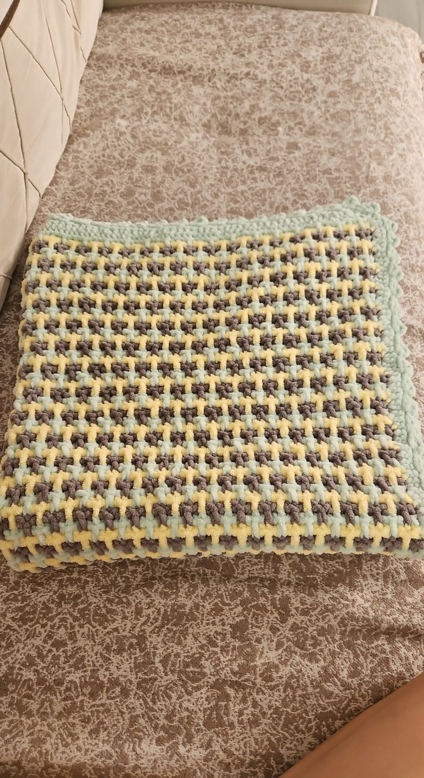 Gri, sarı ve açık mavi tonlarında yumuşak dokulu çok renkli örgü çocuk battaniyesi. istenilen renkte sipariş alınır
