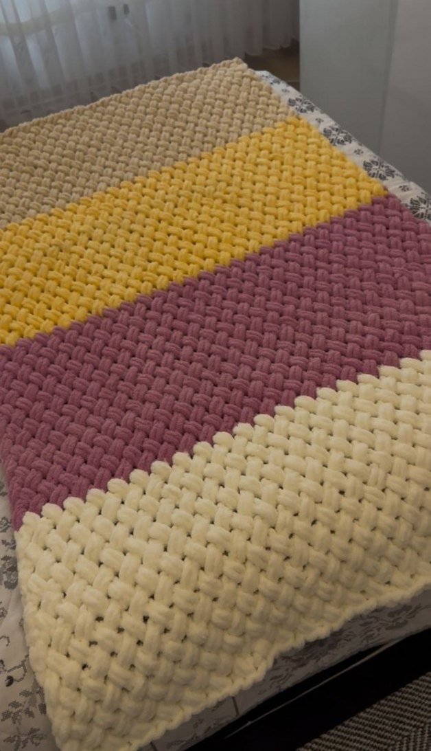 Çocuklar için yumuşak örgü dokulu, açık renkli bej, sarı, mürdüm ve kremden oluşan çok renkli bir battaniye.