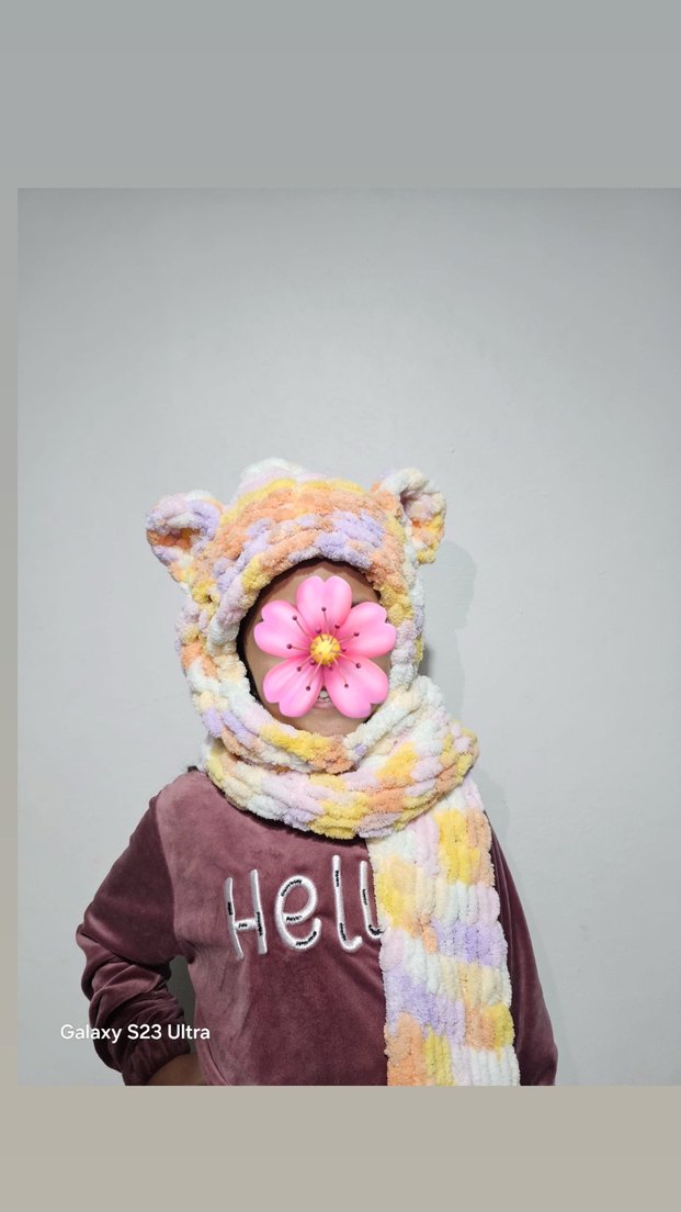 Pastel çok renkli, örgü çocuk bere ve atkı seti, bağlama boyası desenli ve yumuşak dokulu, sevimli ayı kulaklıdır.