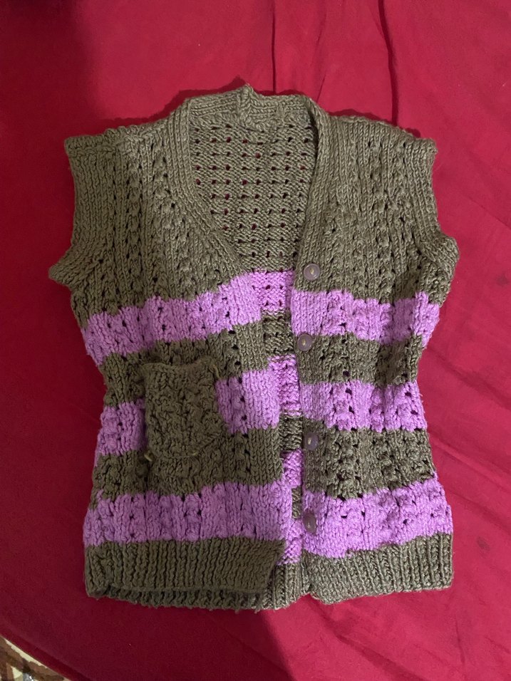 Kolsuz, örgü kumaştan yapılmış, bol kesim ve askısız yakalı bir süveter. Gri ve mor yatay çizgilerle bohem, rahat bir tarz sunar.
