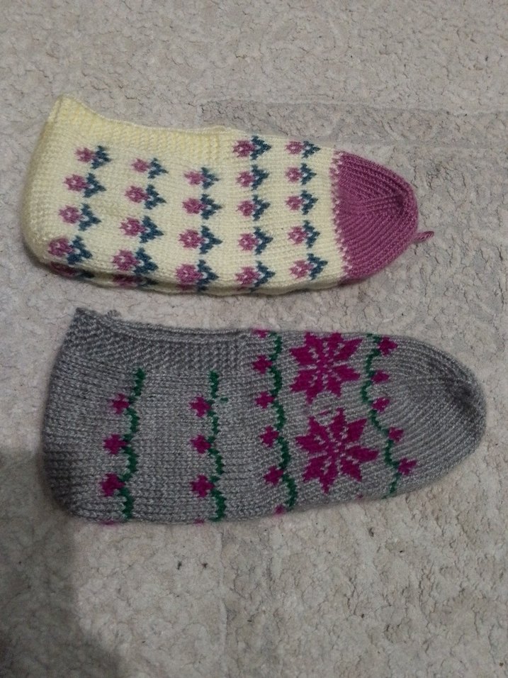 çeyizlik beş şiş patik sıfır . çok renkli nakışlı, örgü yapıda çoraplar. Gri ve mor detaylara sahiptir.