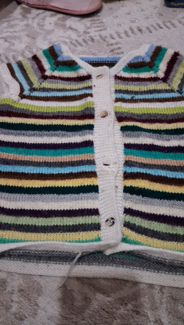 Uzun kollu, bol kesim kız hırkası, örgü kumaştan yapılmıştır. Açık tonlarda çok renkli çizgili ve düğmeli ön kapanışa sahiptir.El örgüsüdr ve popüler markadr 3 4 5 yaşa uygndr