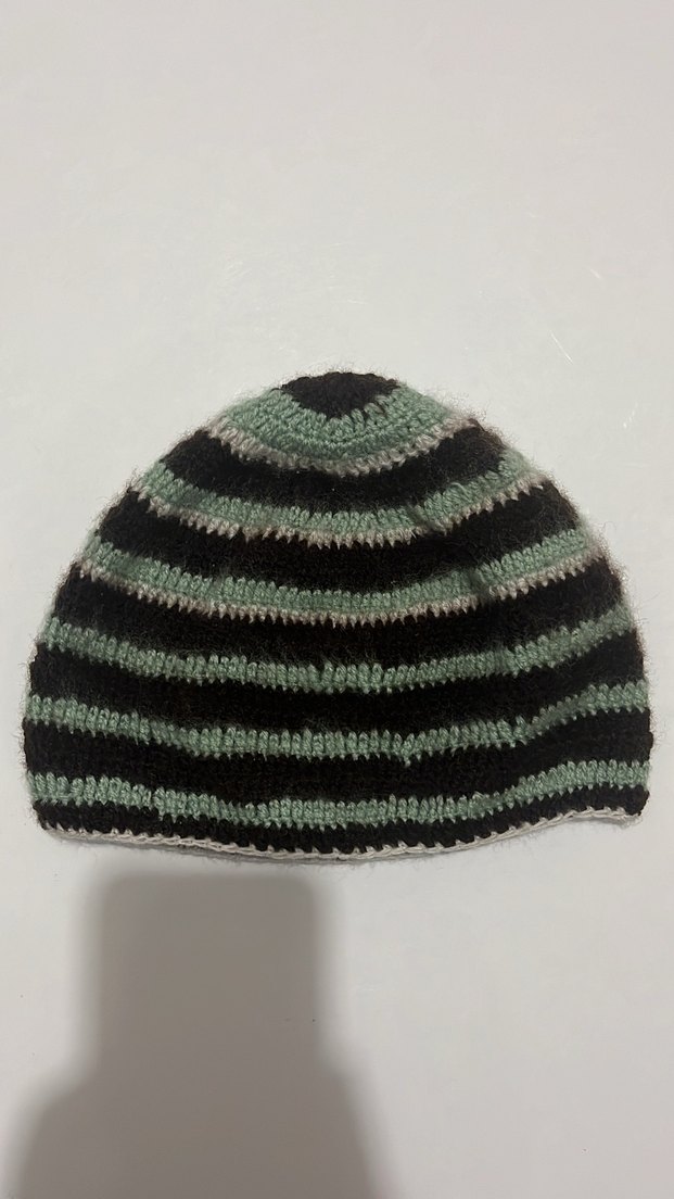 Kadın bere, koyu çok renkli çizgilerle örülmüş, rahat ve retro bohem tarz sunar.
