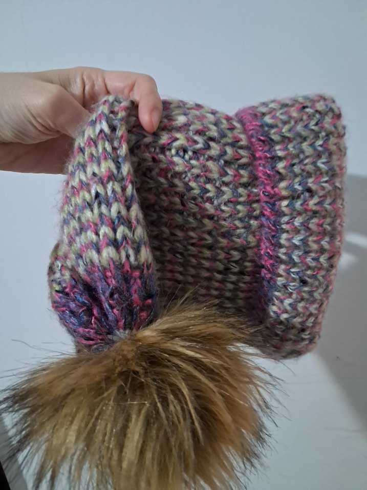 Gri ve canlı renklerin karışımından oluşan örgü kadın bere, yumuşak dokusu ve suni kürk ponponuyla şık ve rahat bir görünüm sunar. yeni sayilir bir problemi yoktur