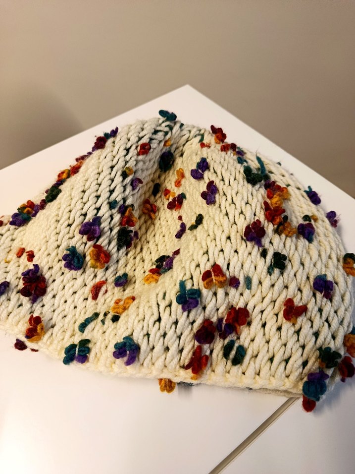 Çok renkli ip detaylarıyla rahat ve bohem tarzda örgü kadın bere, retro ve hippie görünüm için uygun.