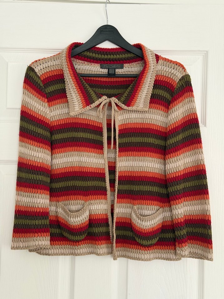 Çok renkli örgü kadın hırka, uzun kollu ve bağcıklı kayık yaka tasarıma sahiptir. Rahat kesim ve iki ön cep ile günlük kullanım için bohem tarz sunar.