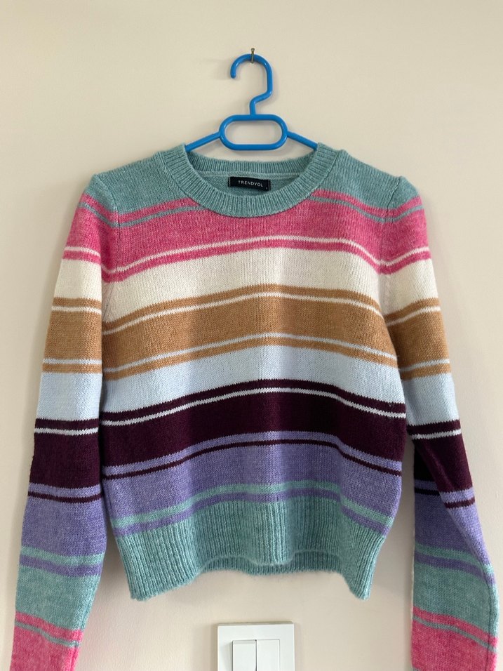 Bu kadın kazak, uzun kollu, yuvarlak yakalı ve örgü dokuludur. Bol kesimi ve pastel çok renkli yatay çizgileriyle rahat bir sokak stili sunar.