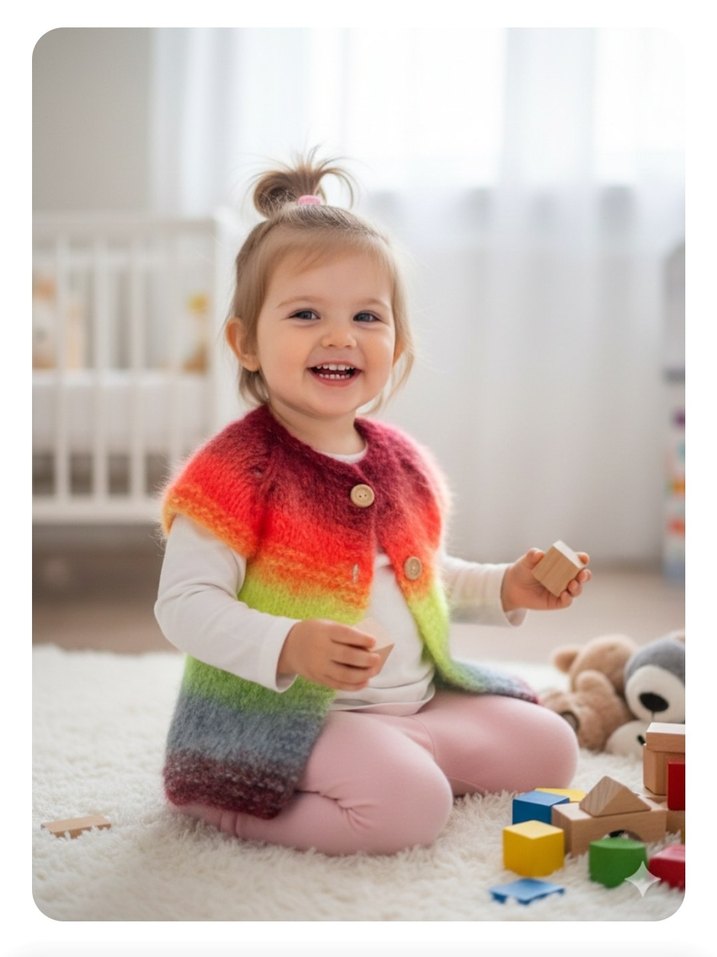 Yumuşak örgüden yapılmış, kolsuz, çok renkli batik desenli kız yeleği. Önünde iki düğme ve yuvarlak yaka bulunur.