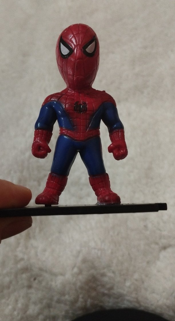 Çok renkli, koyu tonlarda Örümcek Adam figürü. Siyah bir taban üzerinde durmaktadır. ️