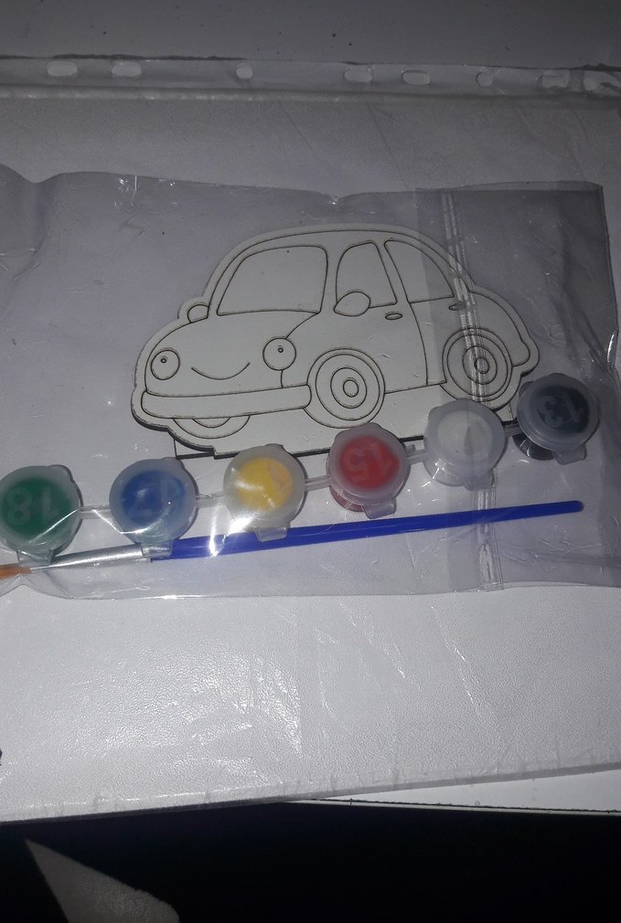 Çok renkli oyuncak araba tasarımı, altı boyama kabı ve fırça ile yaratıcı oyun imkanı sunar.
