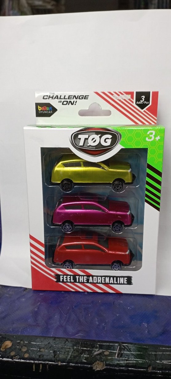 Yeşil, pembe ve kırmızı renklerde üç oyuncak araba seti. Ambalajda 'CHALLENGE ON!' ve 'FEEL THE ADRENALINE' yazıları bulunur. 3 yaş ve üstü için uygundur.